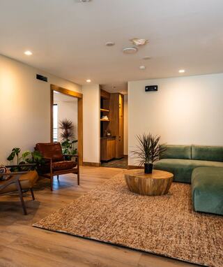 Find flow and focus in our bright and airy movement room, featuring warm wood floors and lush potted plants. Breathe in the fresh air and let the natural setting inspire you to calm yoga, energizing dance, or a creative workout.